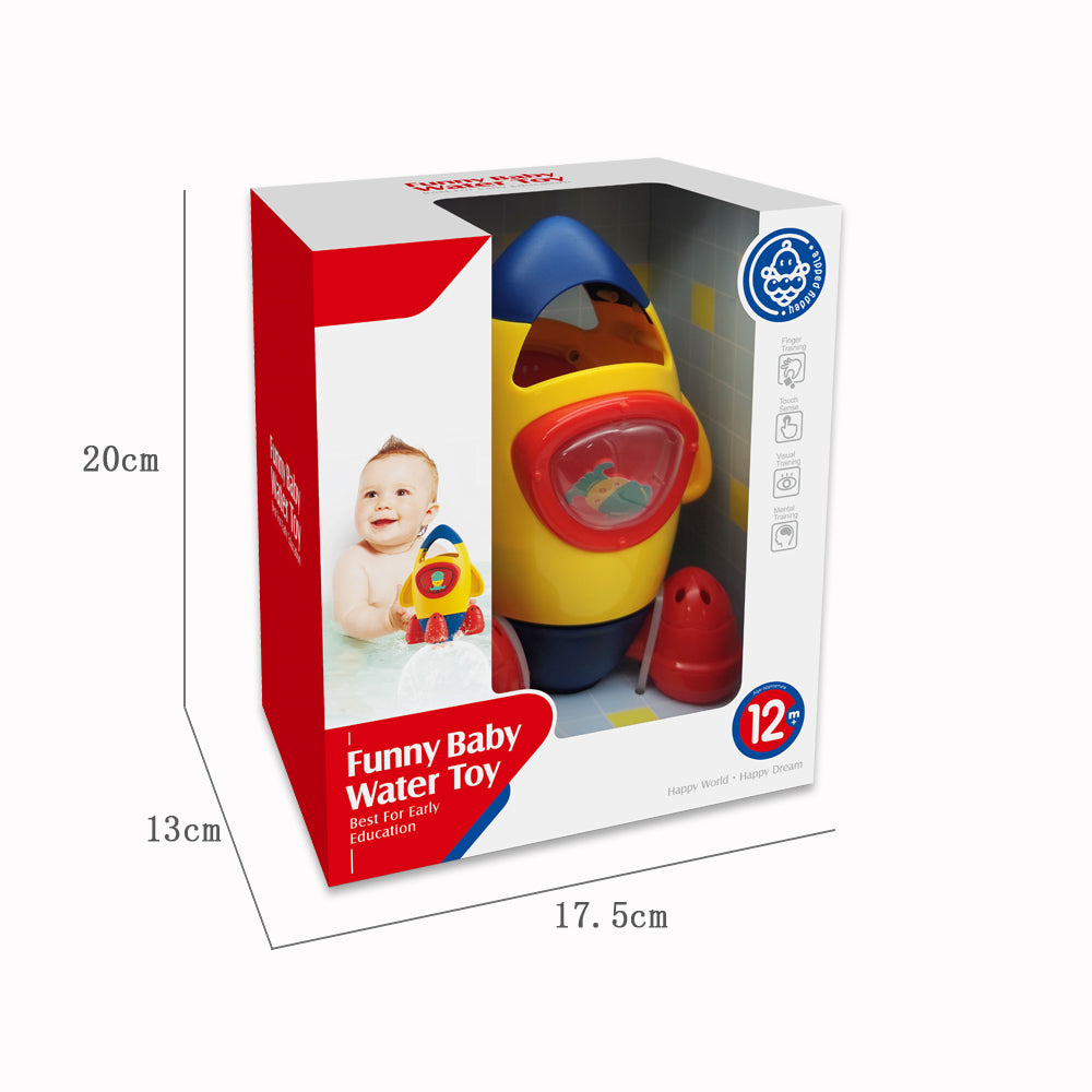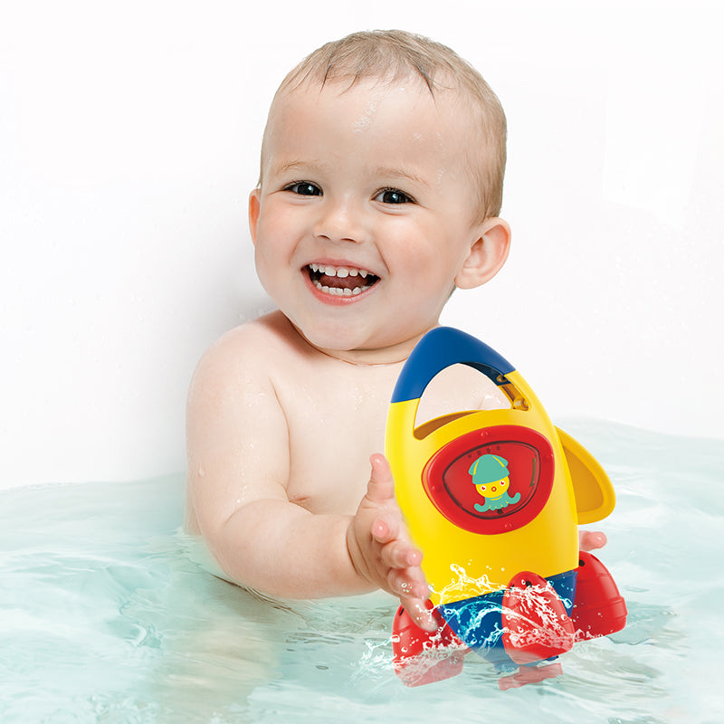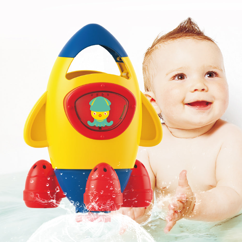 This bath toy consists of a Rocket that is really unique, you know moms, How to play is very easy just dip the rocket into the water until it is full, then lift the rocket, then the water will spray like a rocket when flown