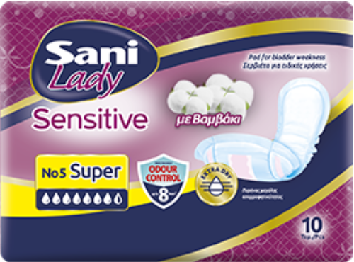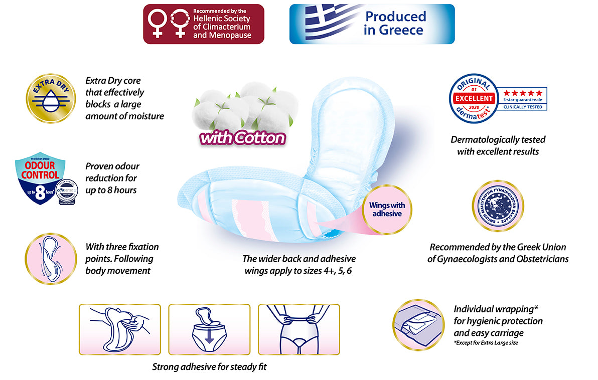Sani Lady pads with cotton are thin and discreet, specially designed for light to medium incontinence and other special uses, such as childbed or post-surgery situations. They combine effective protection from leakage and unpleasant odour, excellent fit and skin friendliness. They are compatible with sensitive skin, thanks to their special cotton topsheet. With an Extra Dry core that offers dryness, holding a large amount of moisture, and a special Odour Control technology that ensures proven protection from unpleasant odour, for hours! Available in 5 sizes, to choose the one that best covers your needs. Individually wrapped* for hygienic protection and easy carry with. Dermatologically tested with excellent results by Dermatest Dermatological Laboratory (Germany). The only incontinence pads recommended by the Greek Union of Gynecologists and Obstetricians and the Hellenic Society of Climacterium and Menopoause.