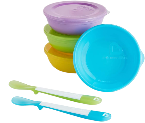 MUNCHKIN BABY FOOD BOWL SET: Set of 4 plastic toddler and baby feeding bowls with lids plus 2 x soft tip baby weaning spoons – perfect for breakfast, lunch, dinner and snack time, at home or away