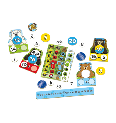 Number Bears is a combined learning activity and game in one. Players must get their bear safely home to their cubs by turning over number cards and solving mathematical problems in this fun number bonds game. But, be careful the bear doesn’t get distracted by the yummy pot of honey or you’ll have to miss a turn!!